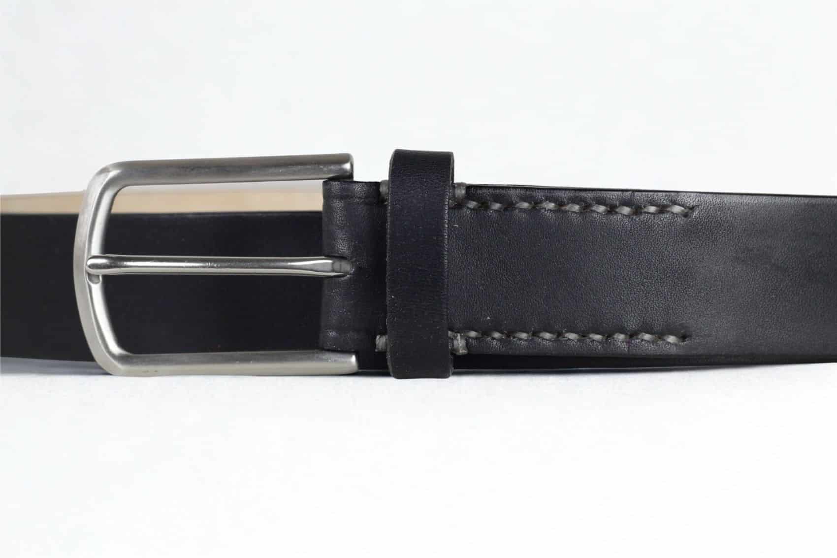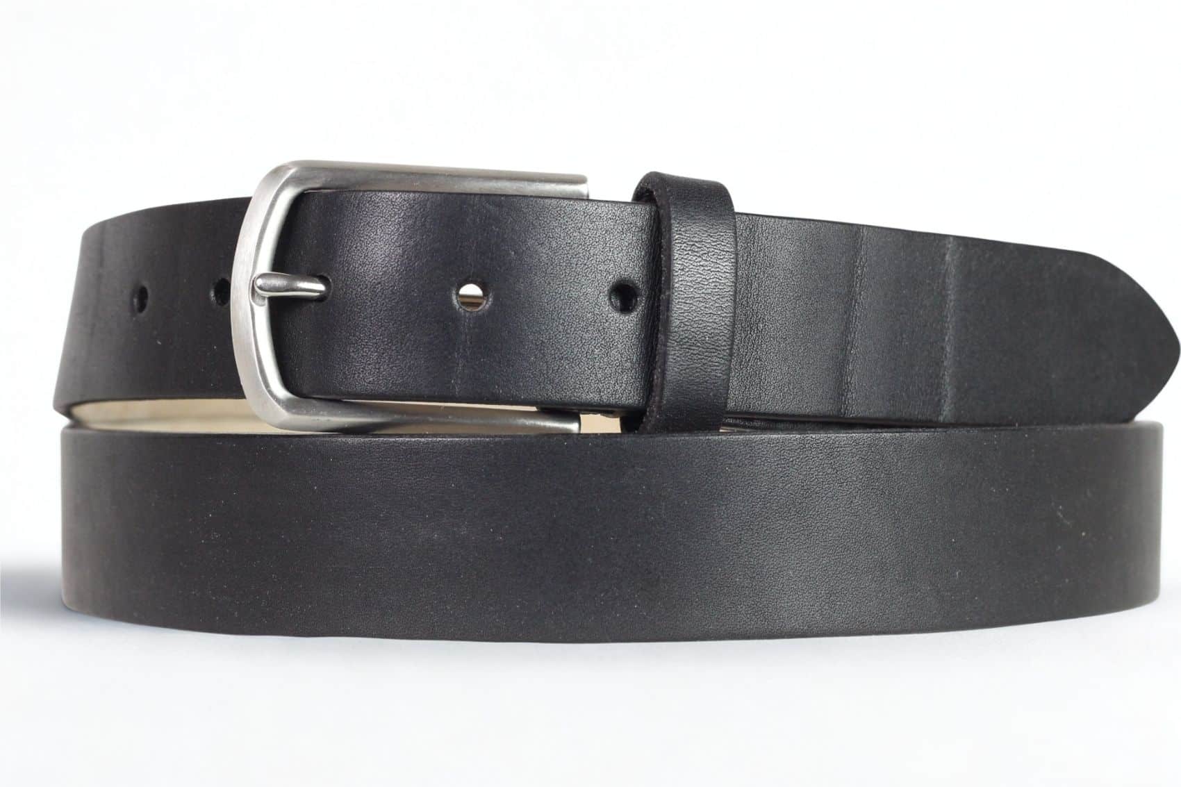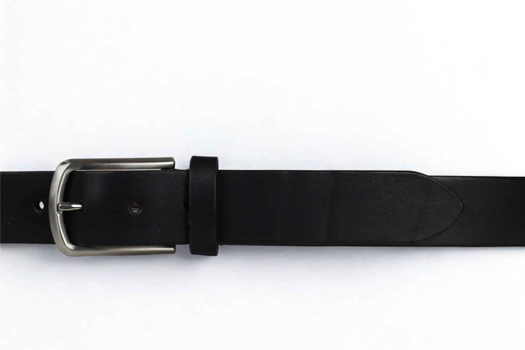 Handmade leather belt 3,5 cm wide in black. The natural markings in the leather are clearly visible.