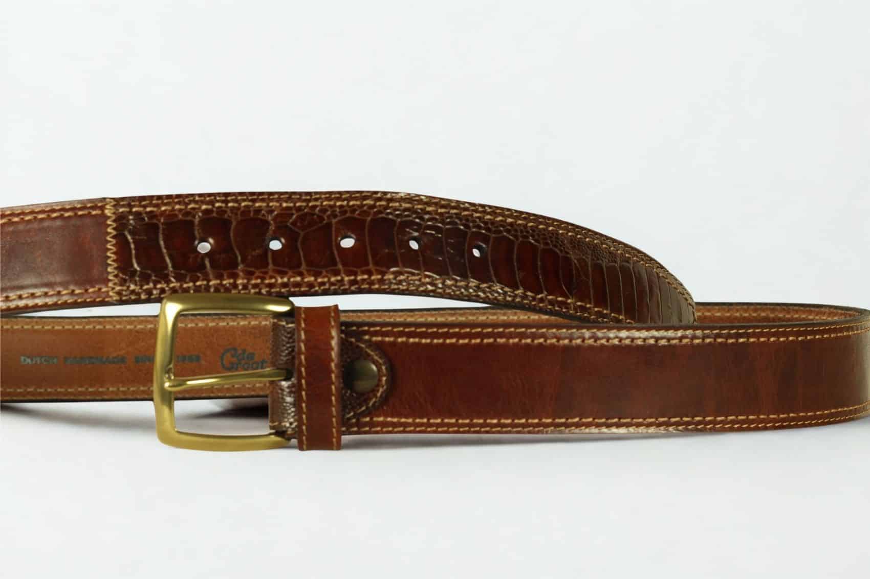 Cognac colored casual leather belt 4 cm wide inlaid with ostrich leather in end of belt.