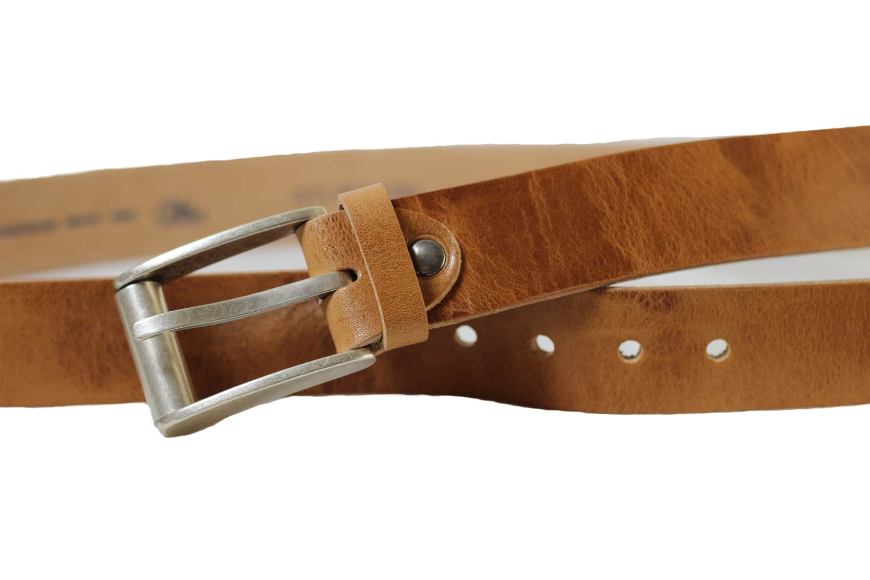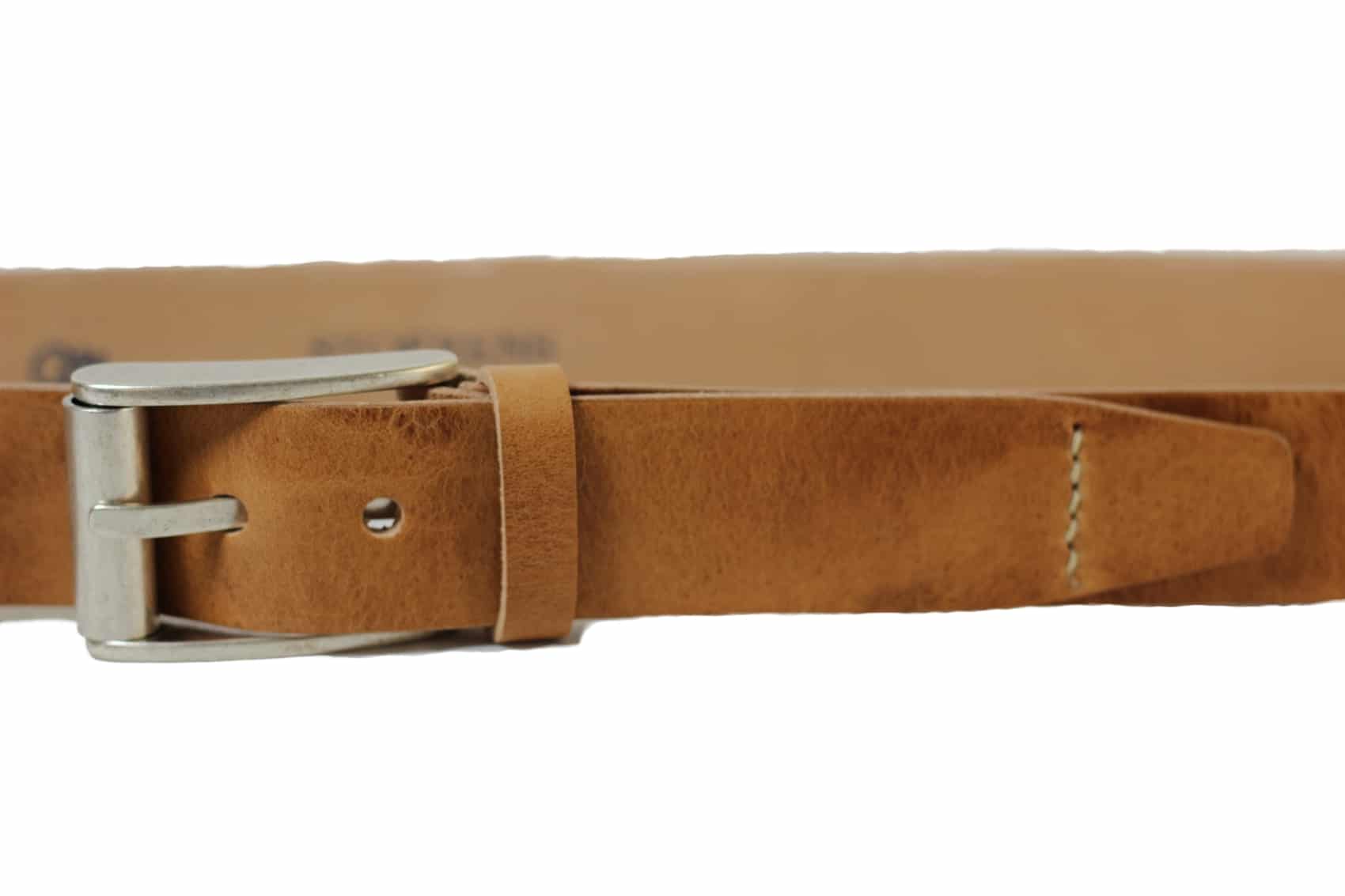 Naturel casual leren riem van 4 cm breed met handgenaaid detail in uiteinde van de riem.