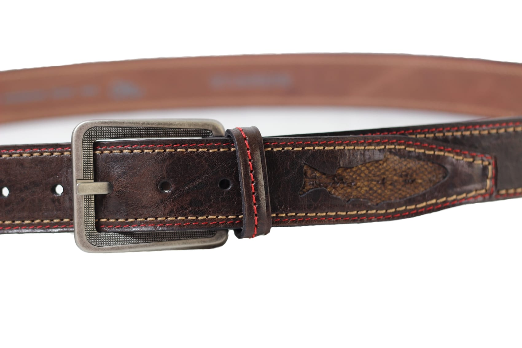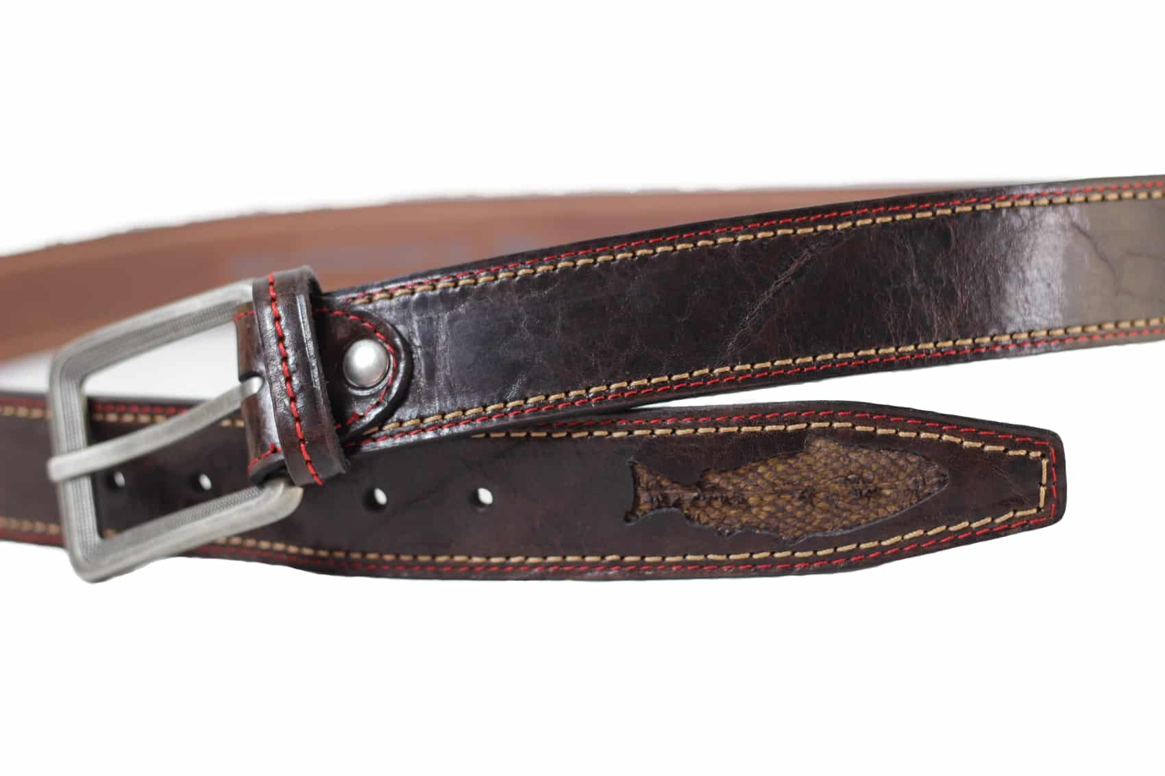 Donkerbruine casual leren riem van 4 cm breed met detail van vissenleer (kabeljauw) in uiteinde van de riem.