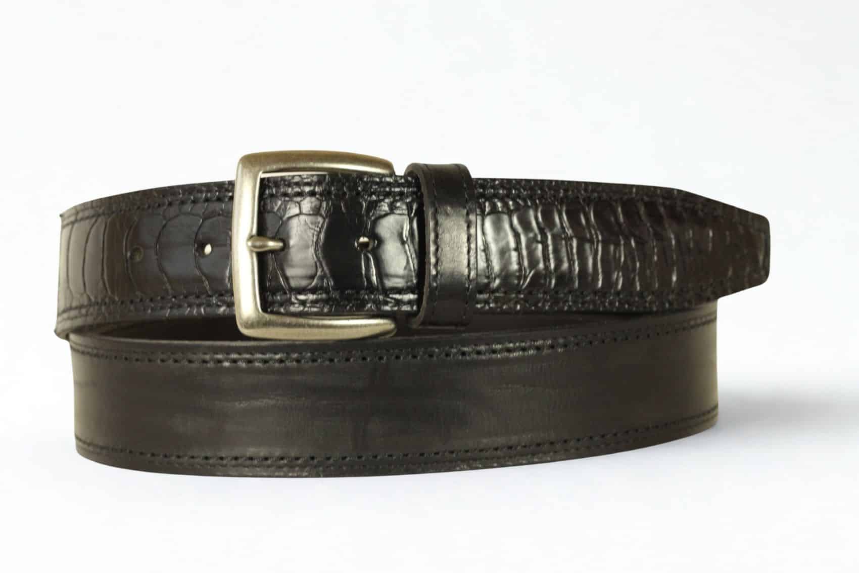 Zwarte casual leren riem van 4 cm breed ingelegd met struisvogelleer in uiteinde van de riem.